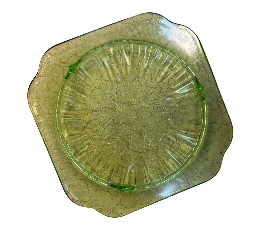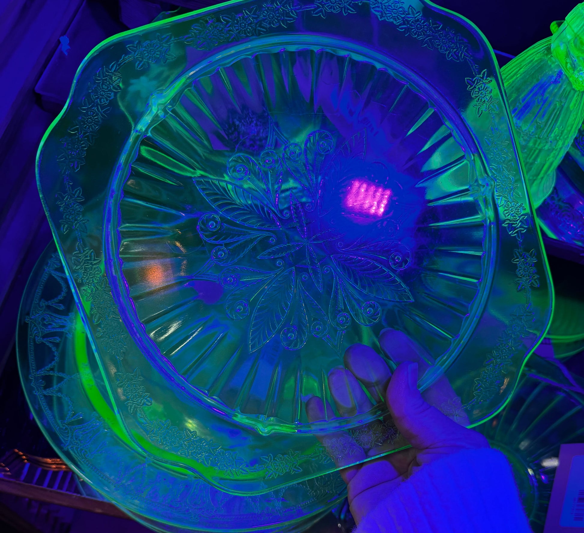 Depression glass refers to a category of inexpensive, mass-produced glassware produced in the United States from the 1920s through the 1940s, during the Great Depression. It was often given away as a promotional item by businesses, such as movie theaters and grocery stores, or sold inexpensively in department stores. The vibrant colors, including pink, green, and amber, were a hallmark of this era's glassware, offering a touch of elegance to households during difficult economic times. Uranium glass, a subset of Depression glass, contains trace amounts of uranium, which causes it to fluoresce a bright green under ultraviolet light.