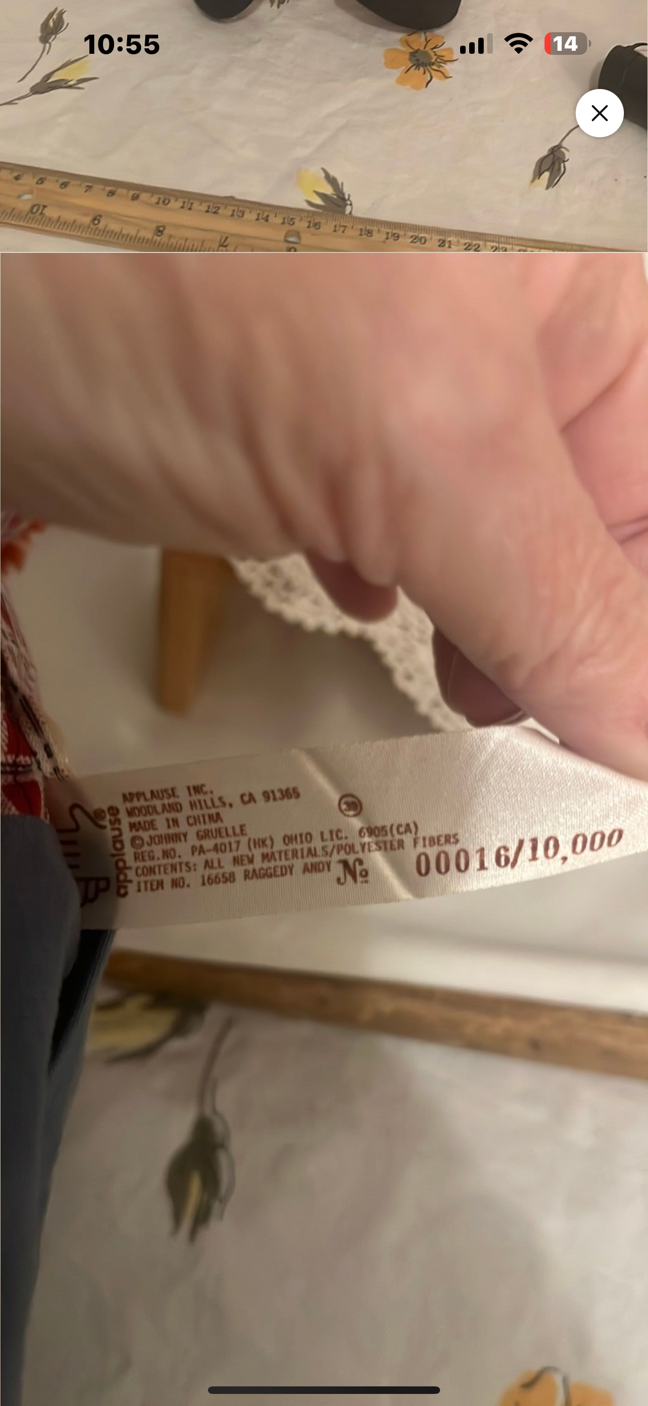 Applause Inc. was a prominent toy manufacturer known for producing a wide range of licensed characters and collectibles, including dolls, plush toys, and figurines. Their production of Raggedy Andy dolls, especially limited edition runs like the one indicated by the tag, appeals to collectors seeking nostalgic and unique items. The 'Made in China' origin is typical for many toy productions from the late 20th century.