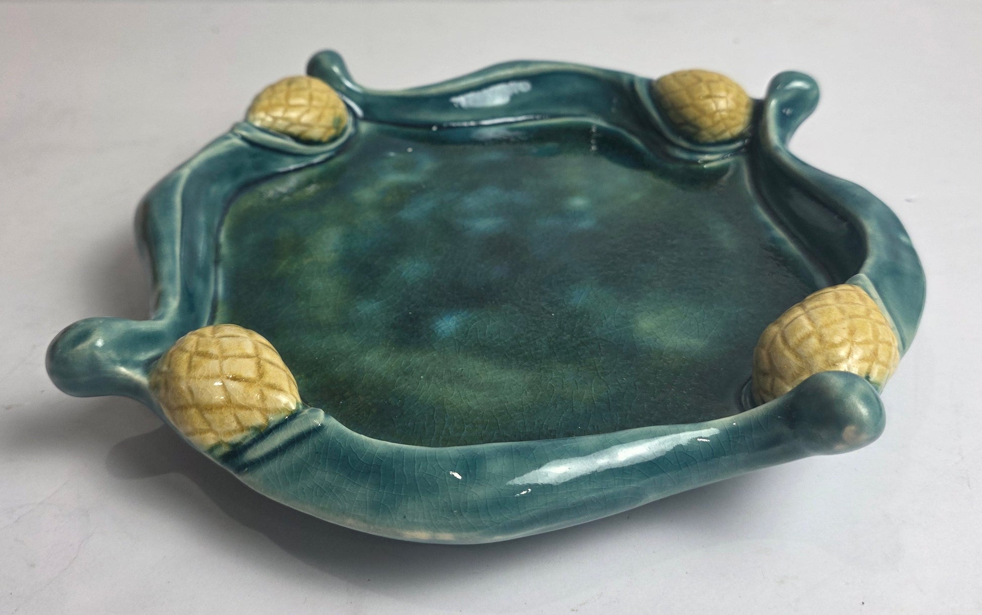 This striking vintage pottery piece features a beautifully organic, sculptural form accented with four raised acorn motifs around the rim. Finished in a rich, mottled teal-green glaze with subtle tonal variation and natural crackle, this dish embodies classic mid-century modern studio pottery aesthetics with earthy charm and artisanal character.
