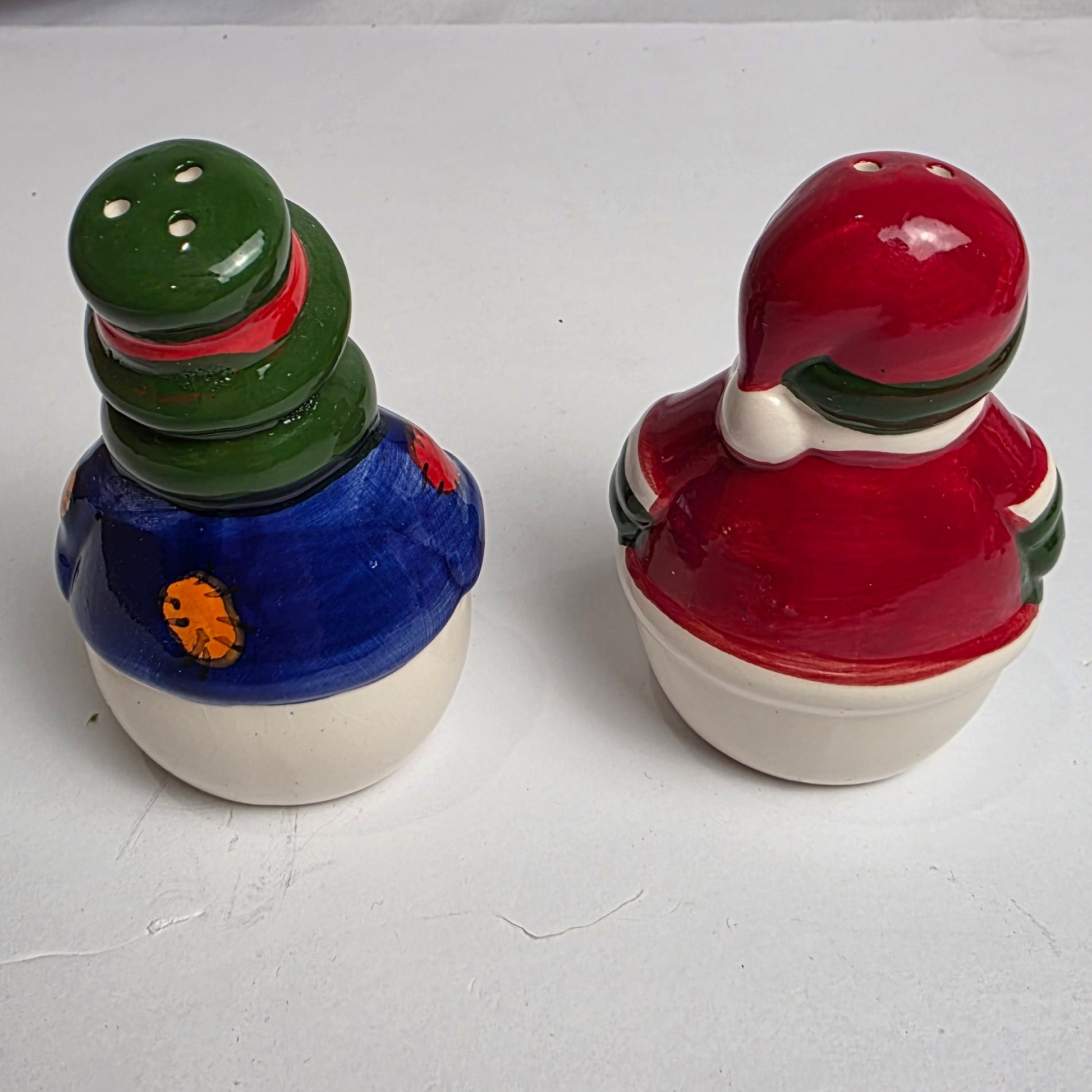 Each snowman is hand-painted in vibrant seasonal colors—one in a blue coat with a green top hat, the other in a red winter jacket and cap—both featuring sweet details and expressive faces. Their rounded bodies make them easy to hold, while the original shaker holes and bottom plugs remain intact and functional.