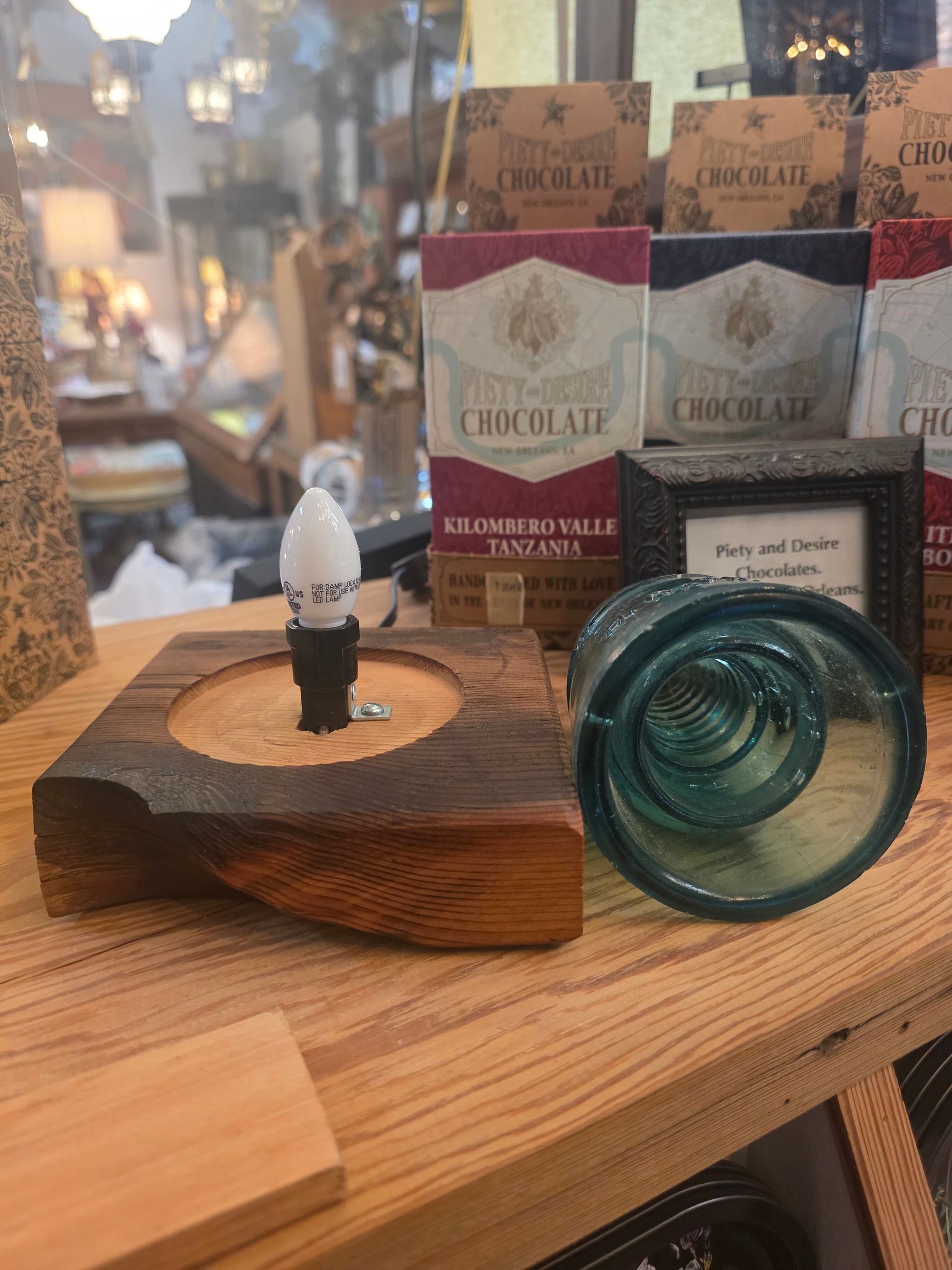 Illuminate your space with this handcrafted vintage teal H.C. & Co. power line insulator lamp, thoughtfully assembled in New Orleans. This striking piece combines an authentic early-20th-century H.C. & Co. teal glass insulator with a sculpted block of reclaimed Louisiana cypress, blending industrial history with rustic Southern charm.