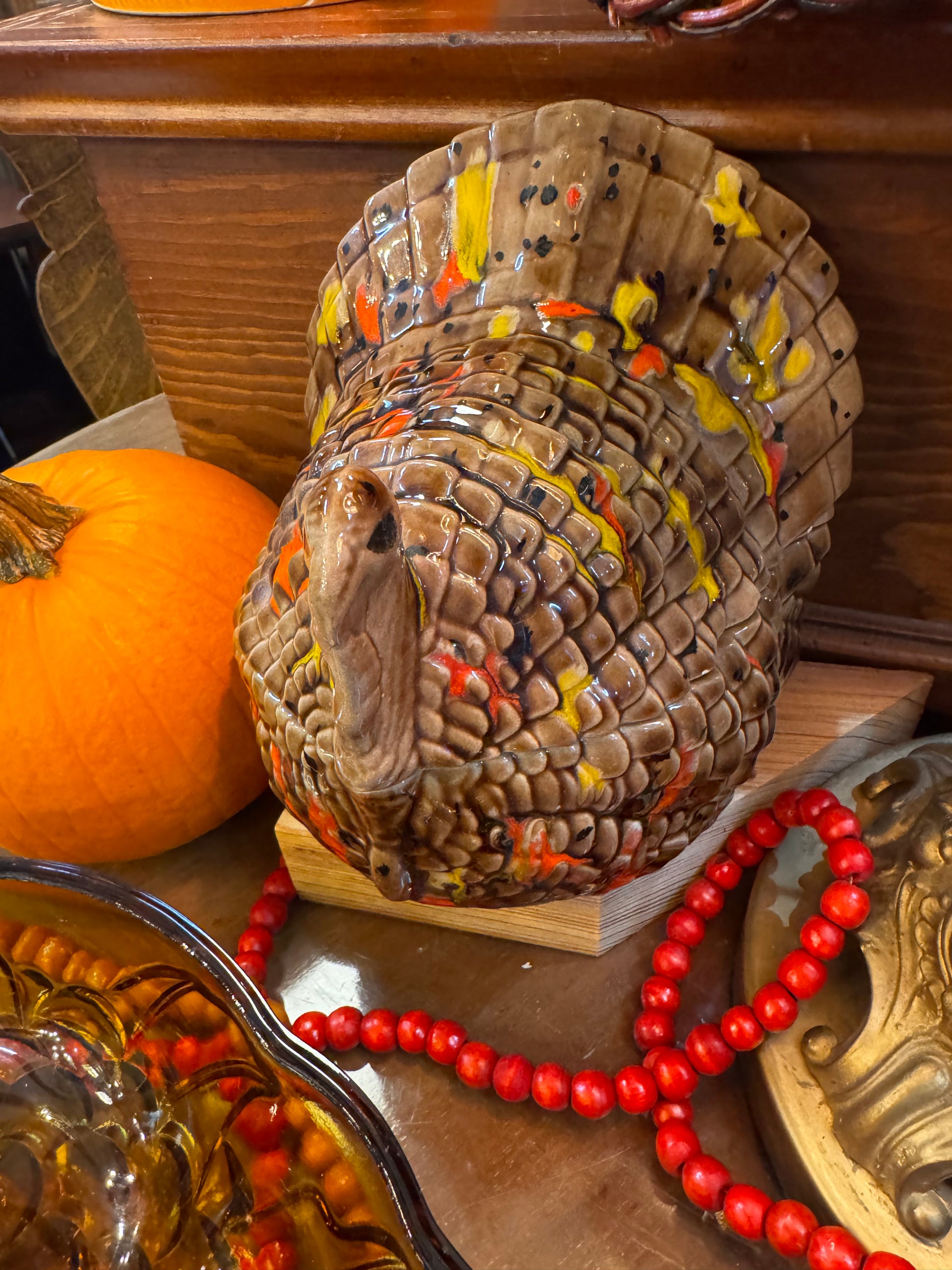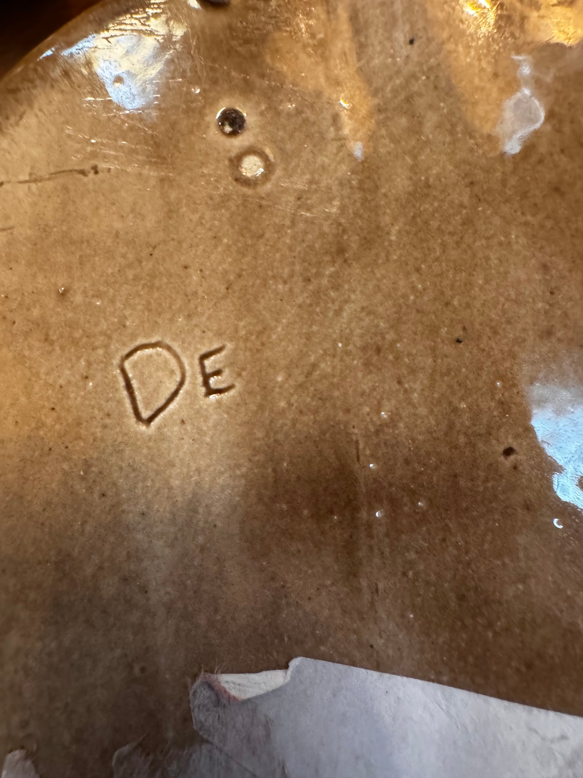 This vintage, two-piece ceramic turkey lidded dish is a charming mid-century collectible, likely dating to the 1970s or 1980s. It features a rich brown, scaled body with a rustic drip glaze on the tail feathers accented in yellow, red, and orange, making it a perfect centerpiece or serving dish for Fall and Thanksgiving decor.[1, 2] The base is impressed with the simple initials "DE" [Image 2], indicating it is a hand-painted piece likely signed by the artisan who finished the ceramic mold.