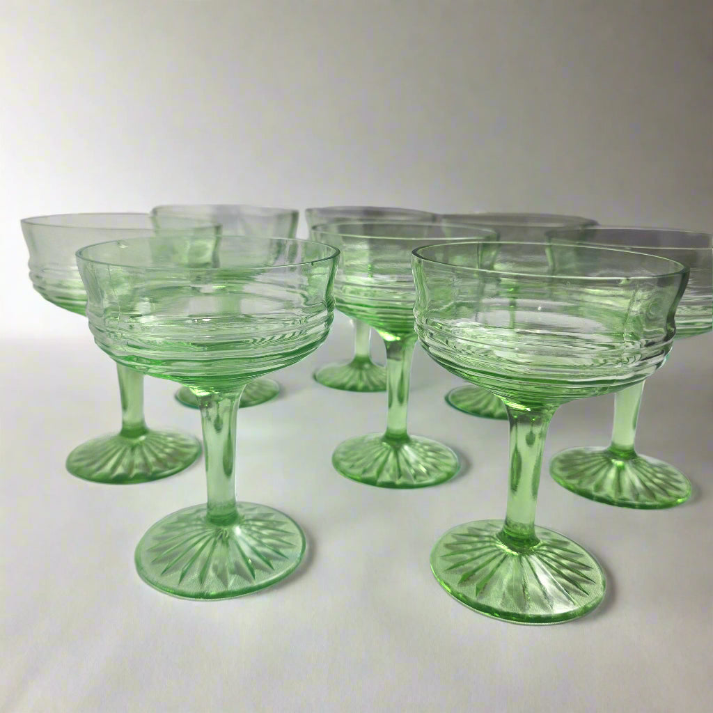 Set of 8 Vintage Green Uranium Glass Coupe Glasses – Art Deco Style, Glow Under UV Light