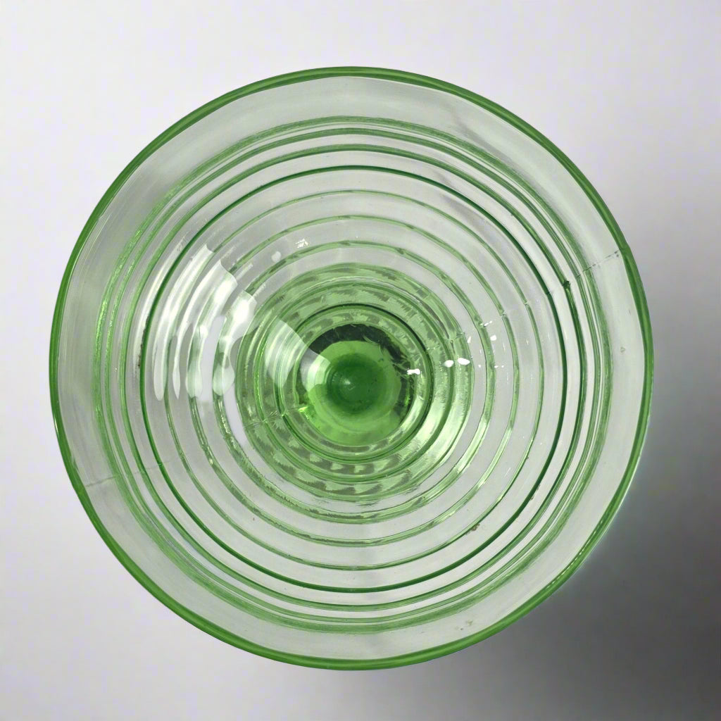 Bring timeless elegance to your collection with this stunning set of 8 vintage uranium glass coupe glasses. Crafted in a striking translucent green, these glasses feature a ribbed bowl design and starburst pattern base, making them a beautiful example of early 20th-century glassware.