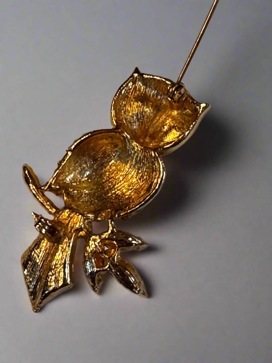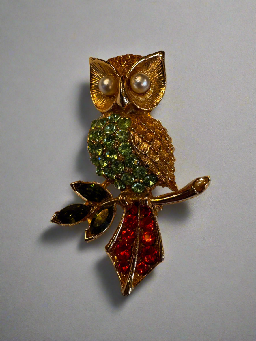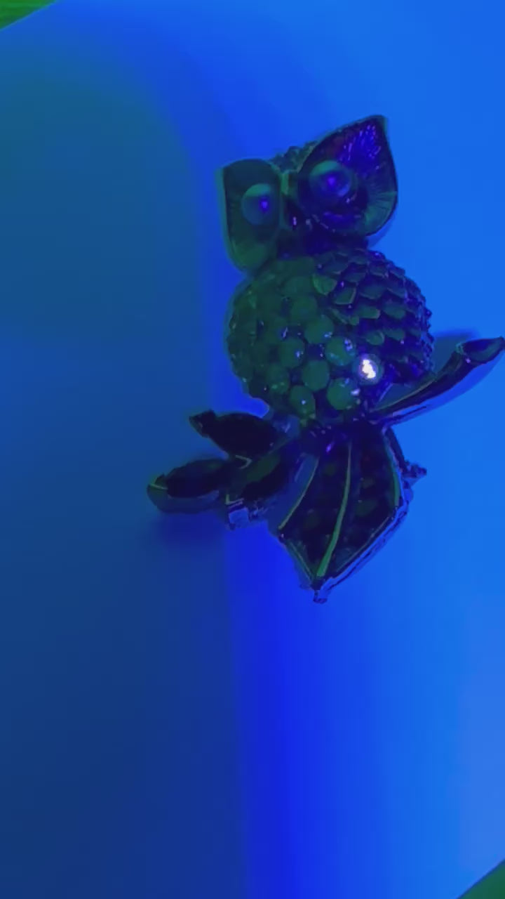 Vintage uranium glass owl brooch with green rhinestones that glow under blacklight, featuring faux pearl eyes and a gold-tone finish.