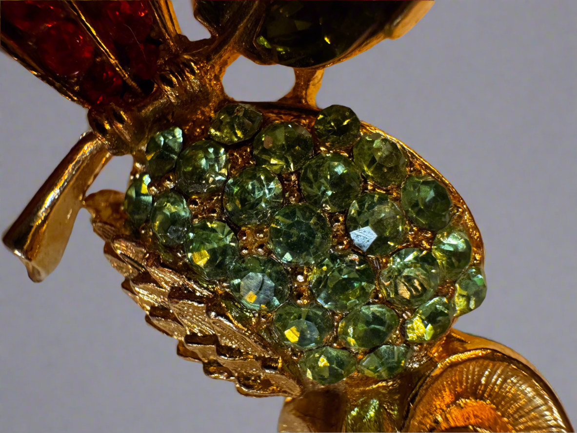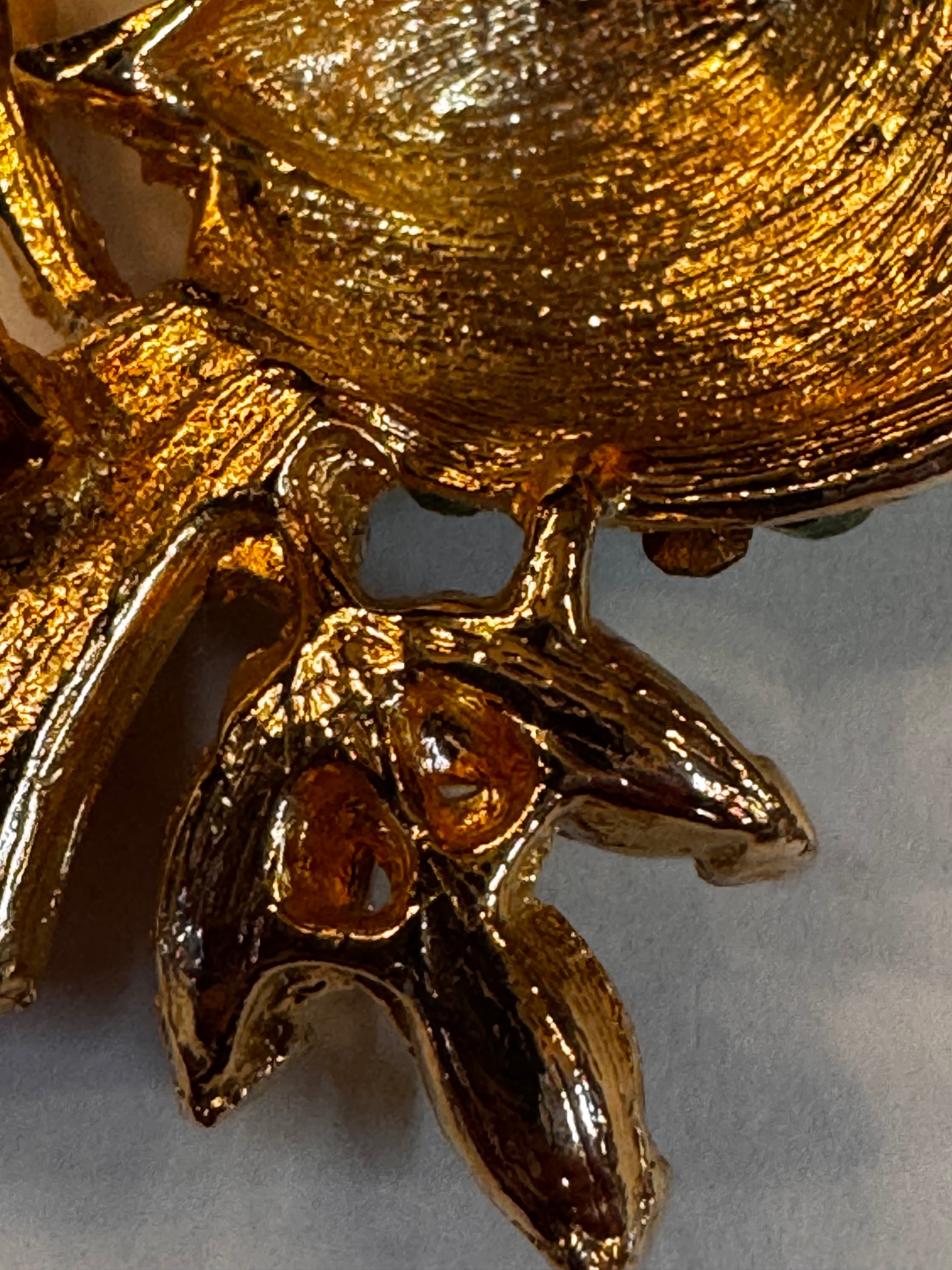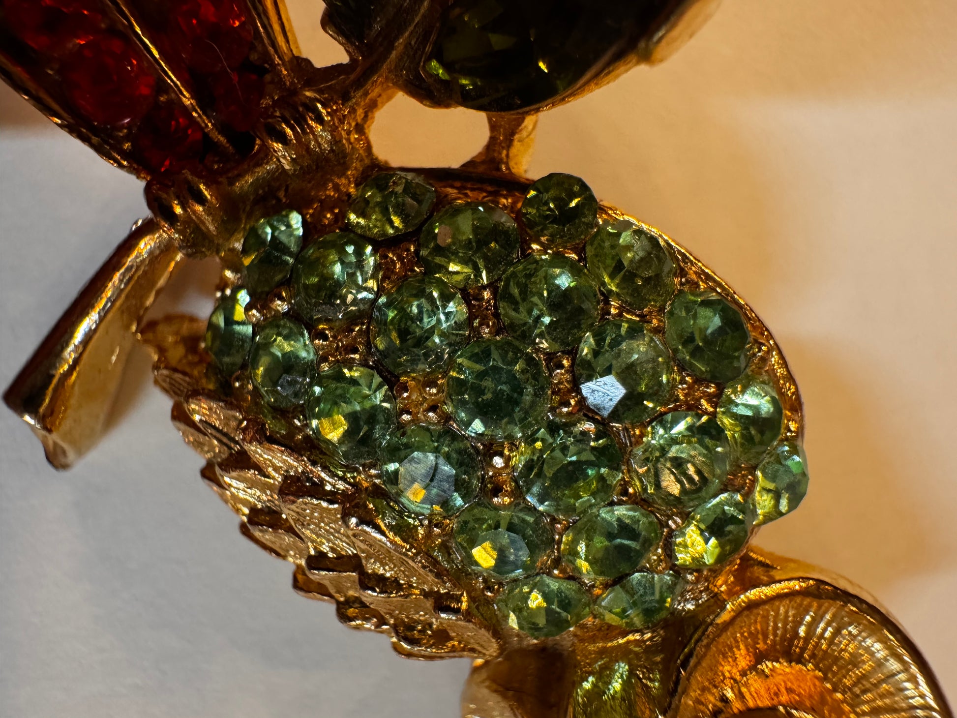 Vintage uranium glass owl brooch with green rhinestones that glow under blacklight, featuring faux pearl eyes and a gold-tone finish.