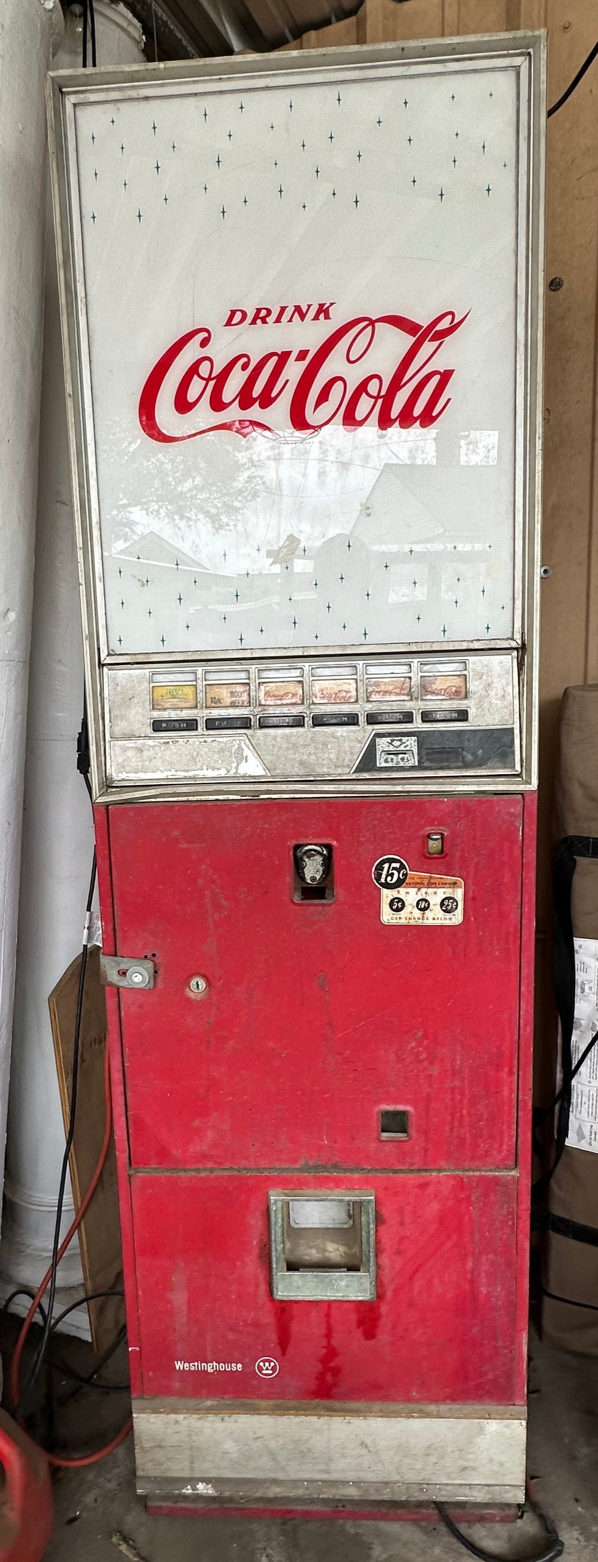 This vintage Westinghouse Coca-Cola branded vending machine is still in working order and has the dimensions of 81.5x23.5x22.5 inches.
