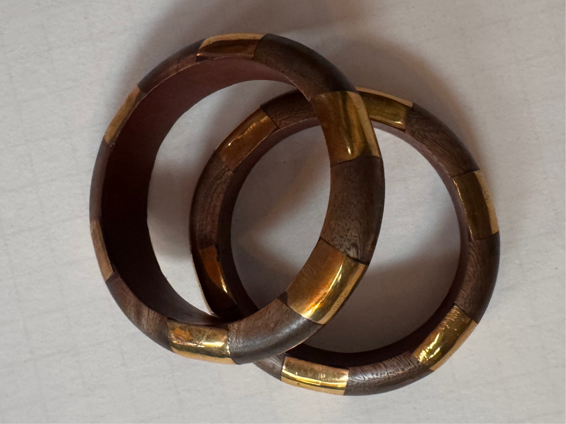 These bangles, likely from the 1970s, showcase a timeless blend of wood and brass. The combination of natural wood tones and industrial brass accents was particularly popular in the mid-20th century, reflecting the era's appreciation for both handcrafted and modern design. Their warm colors and geometric patterns make them a classic example of mid-century modern style, perfect for vintage fashion lovers.