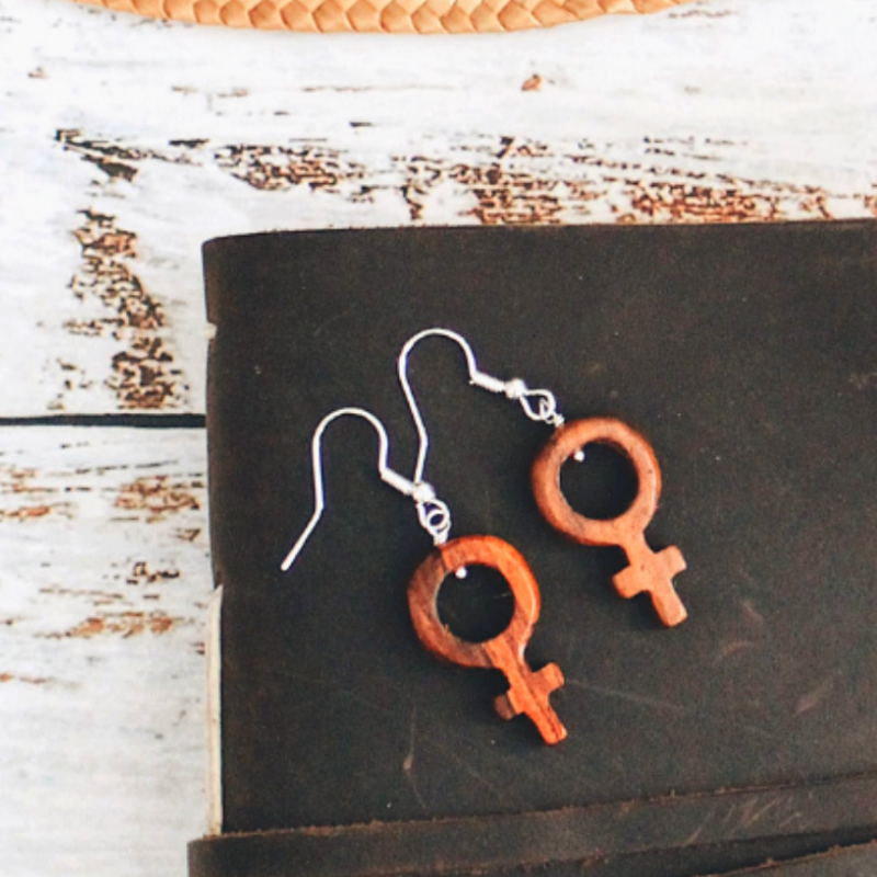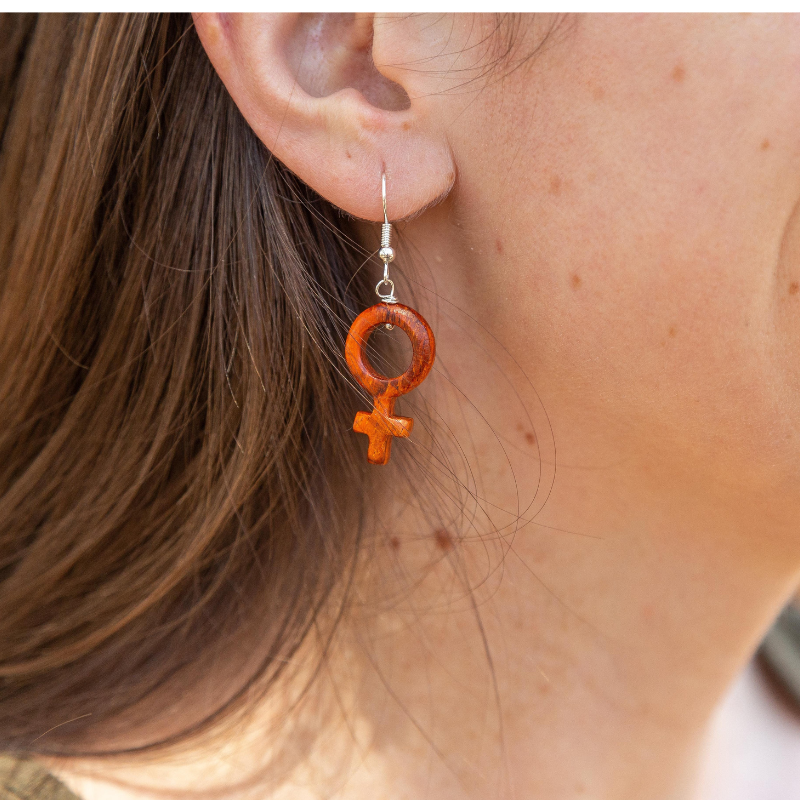 These natural wood earrings are carved to represent the female symbol. Crafted from recycled Granadilla wood and featuring sterling silver ear wires. Measuring 1 3/4" long including ear wire, 5/8 wide, they are very lightweight and comfortable to wear.