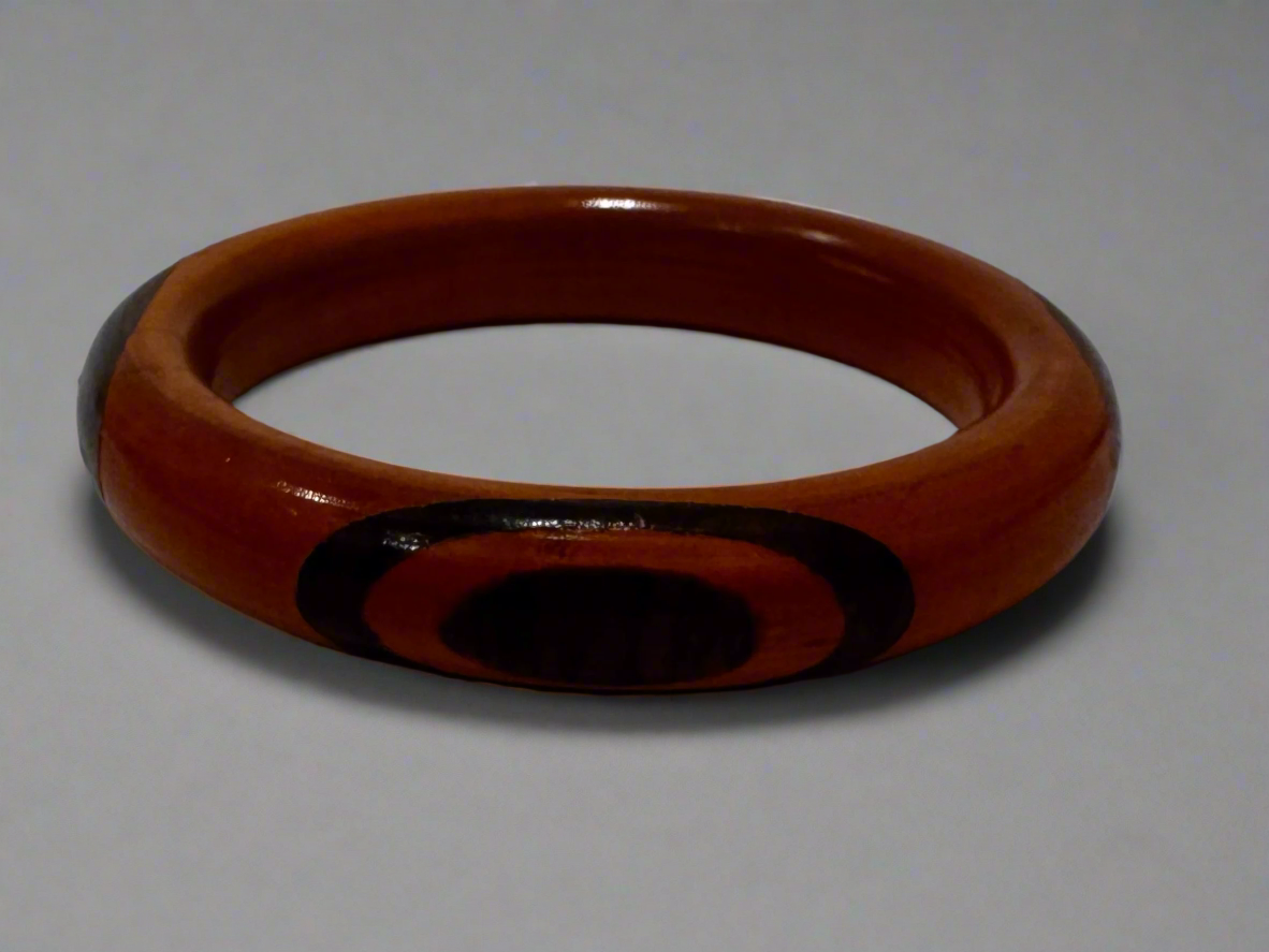 Vintage wooden bangles, like this one, often showcase distinctive designs and craftsmanship from specific eras. The inlaid pattern suggests an artistic touch, possibly influenced by mid-century modern aesthetics. Such pieces are appreciated for their retro charm and the connection they provide to past fashion trends.