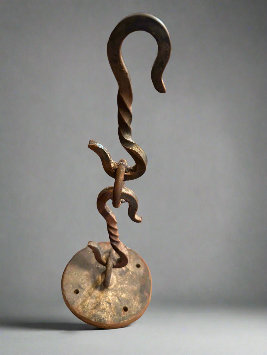 This one of a kind light fixture was made by fusing wrought iron hooks and rings together.