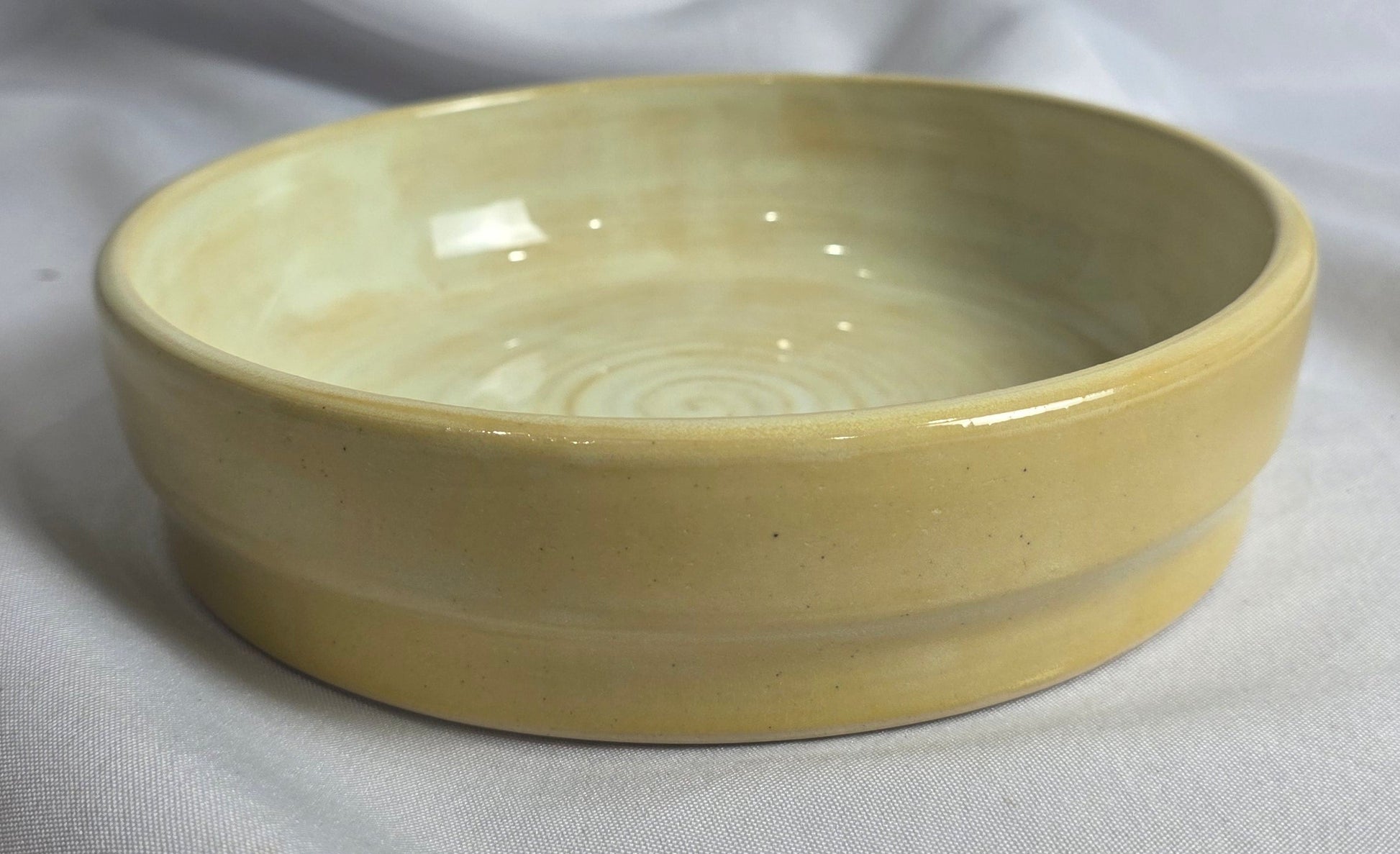 Soft yellow glaze with gentle variations and visible wheel-thrown spiral in the center